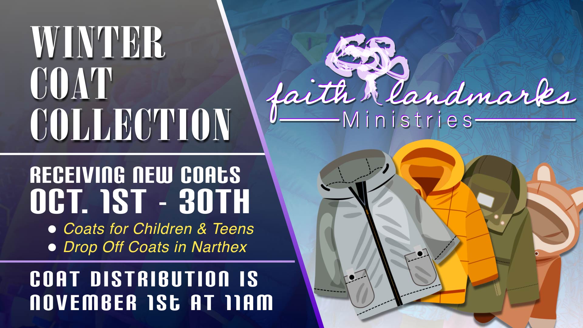 Receiving new coats for children & teens. Drop off coats in the Narthex. Coat distribution will be November 1st at 11am.