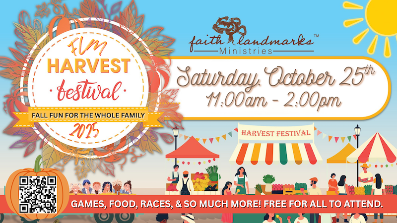 Vendor spaces are $25 per parking spot. NOTE: Tables and electricity will not be provided. (Please…no Food Vendors but we can allow specialty drinks and desserts vendors.) Faith Landmarks will be selling food: hamburgers, hotdogs, fries, etc…