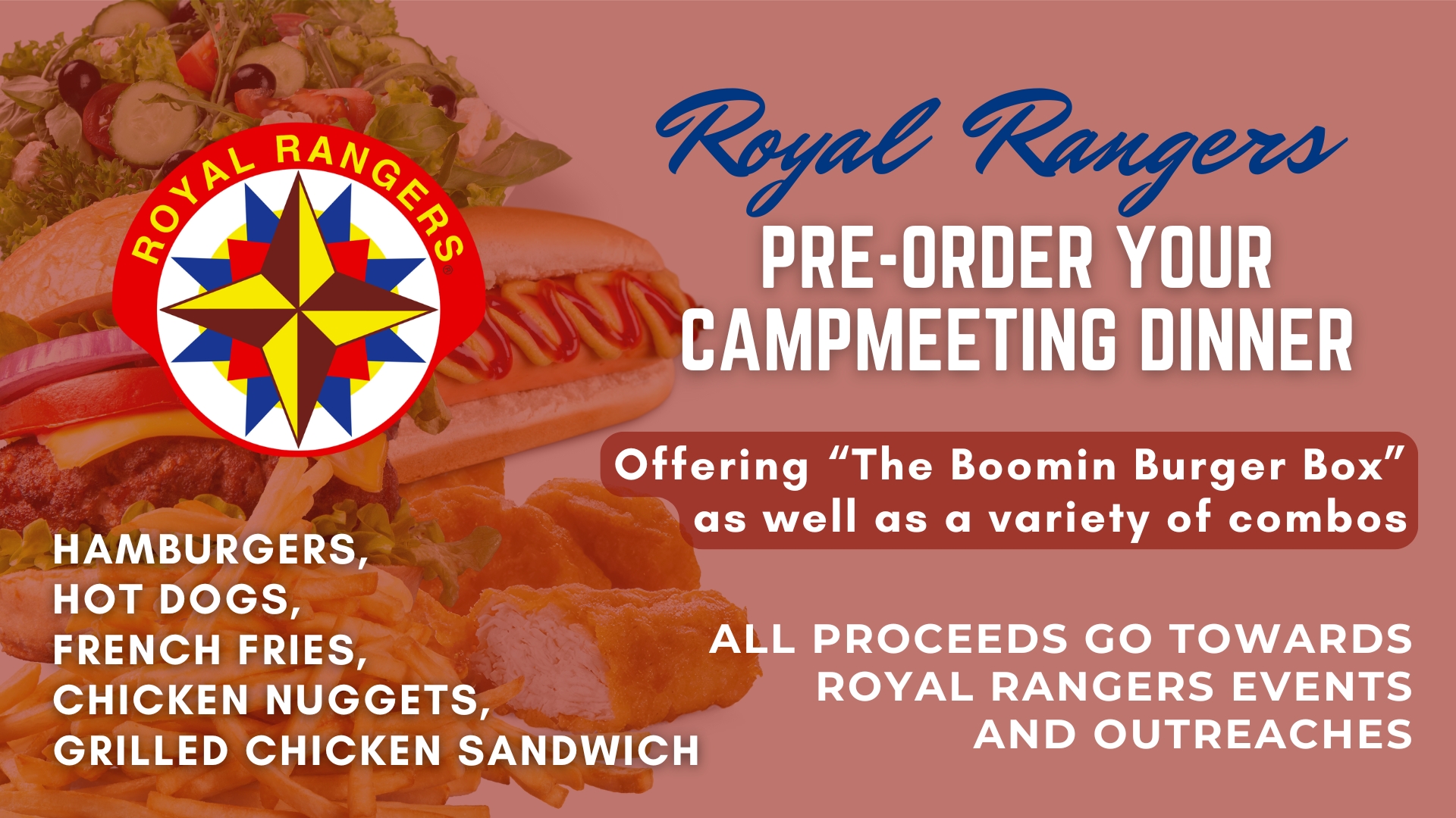 Campmeeting pre-orders for dinners will be hosted by the Royal Rangers. Offering hamburgers, hot dogs, french fries, chicken nuggets, and grilled chicken sandwich. All proceeds go towards Royal Rangers Events and Outreaches.