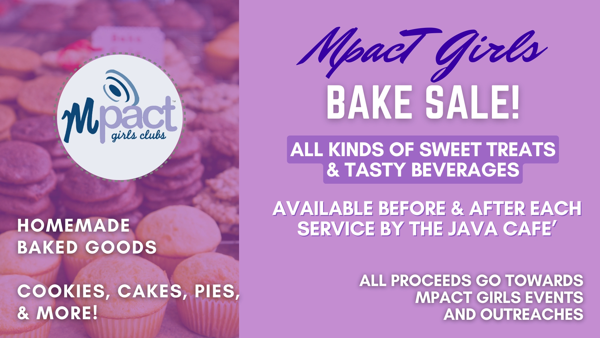 We are inviting “quality” bakers to donate their favorite homemade baked goods to the Mpact Girls Annual Campmeeting Bake Sale Fundraiser. We will receive your donated homemade baked goods at Java starting Sunday morning, October 12th. Thank you for supporting the Mpact Girls Ministry!