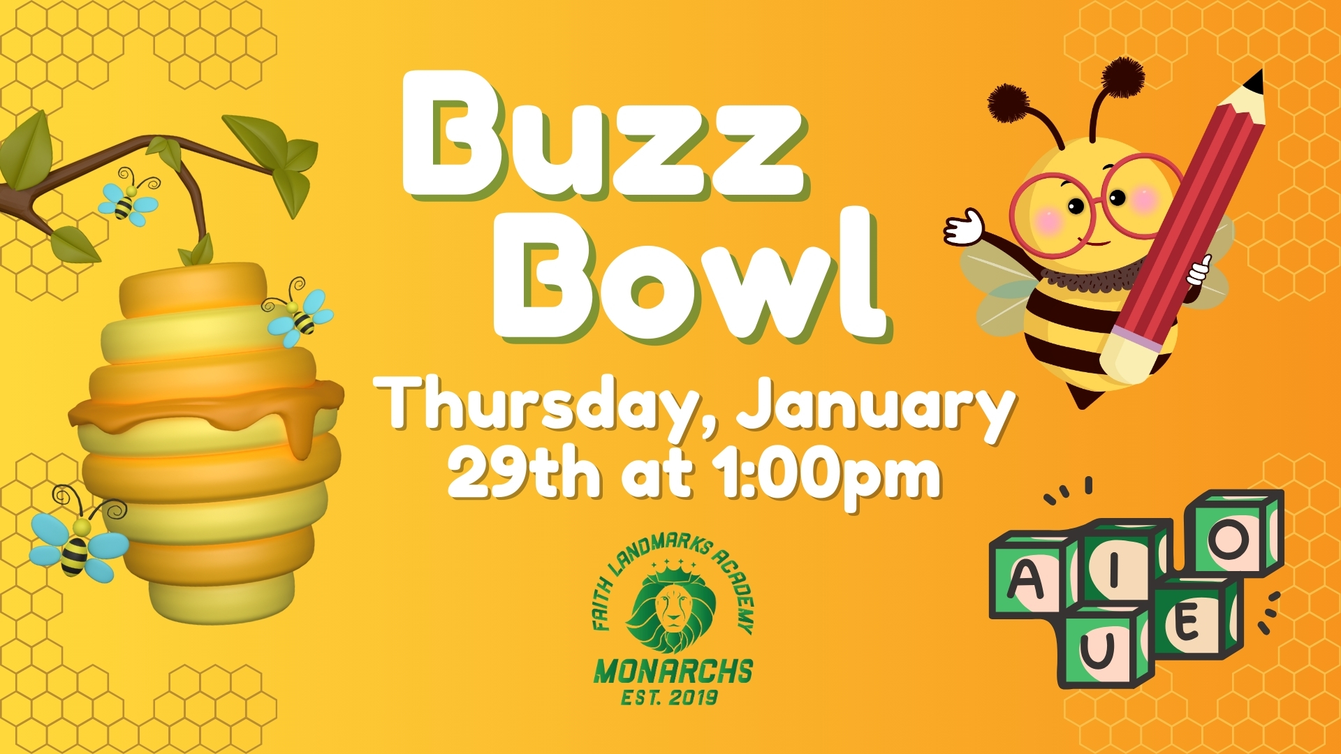 Join the Buzz! Come cheer on our FLA Monarchs as they showcase their Spectacular Spelling Skills in a fun, friendly showdown of words and wits! This event is open to ALL — bring your school spirit and get ready to BEE amazed!