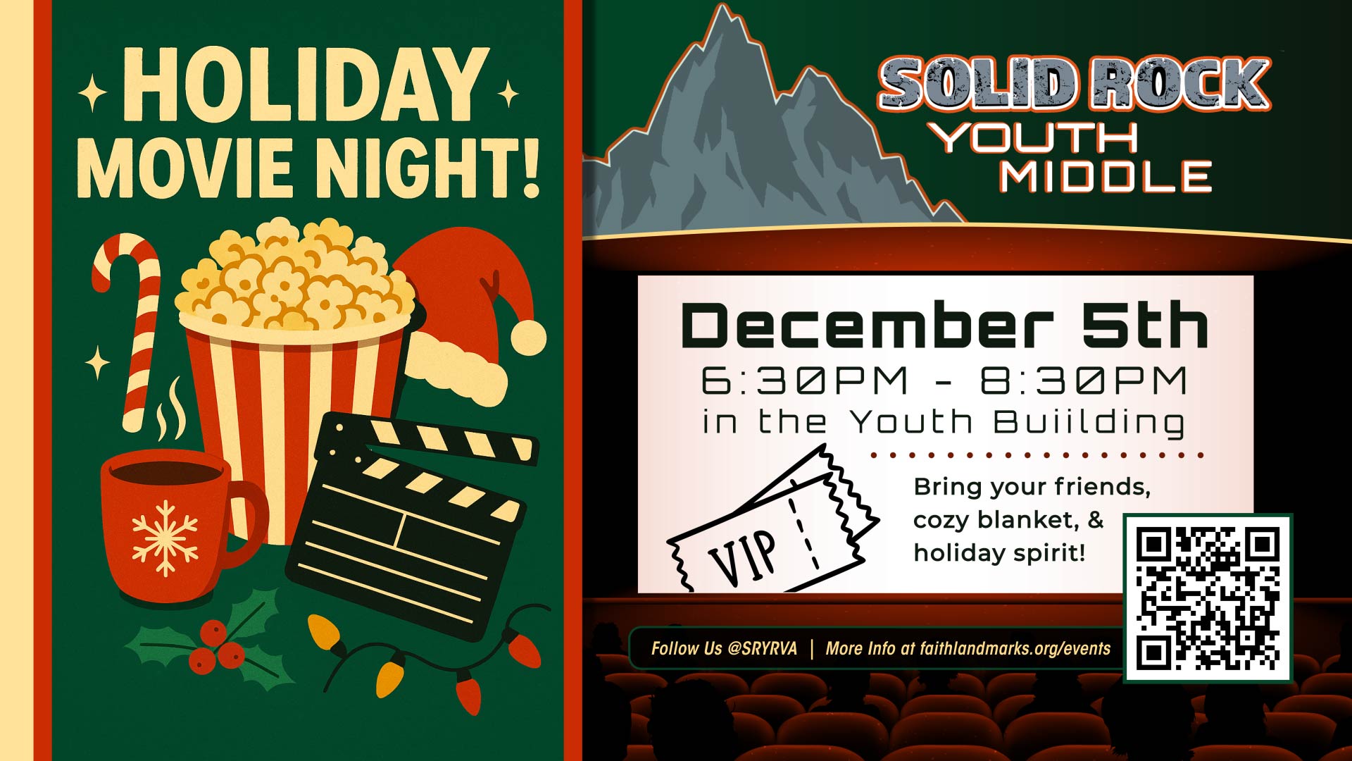 Hey Middle Schoolers! Get ready for a night full of holiday cheer, laughter, and your favorite movies! Join us for Holiday Movie Night in the Youth Building on THIS Friday, December 5th from 6:30PM to 8:30 PM.